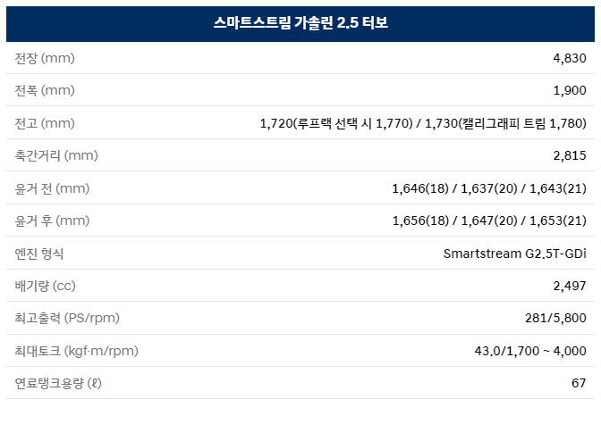 - 차량을 구매하고 얼마나 운행을 할 것인지에 따라 단기간 운행에는 2.5 터보, 장기간 운행에는 1.6 하이브리드가 더 나을 것이라 생각됩니다.
